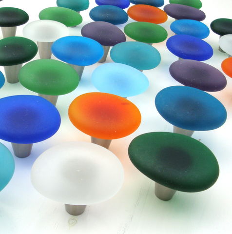 The Beach Glass T Knob is a long version of the handmade Eco "Sea Glass" Stone drawer pull /cabinet knob / furniture pull. It brings a natural, rustic look of the sea to your kitchen or bath. Each Long Sea Glass Stone T knob is made from an elongated turquoise piece of "beach glass" which is actually recycled glass that has been collected and tumbled in the USA. The glass is 2 3/4" to 3 3/4" long, 3/4" thick, and each piece is unique. The glass is then permanently affixed to high quality cabinet hardware. The center mounted hardware piece has a satin nickel finish (or chrome, or oil rubbed bronze, please indicate choice in Note to BeachyRustica during checkout), projects 5/8" from the mounting surface before addition of the glass, and includes a threaded 1" screw. The hardware has a tiny peg on the bottom that keeps the knob from twisting with use, it's not visible when the knob is installed.